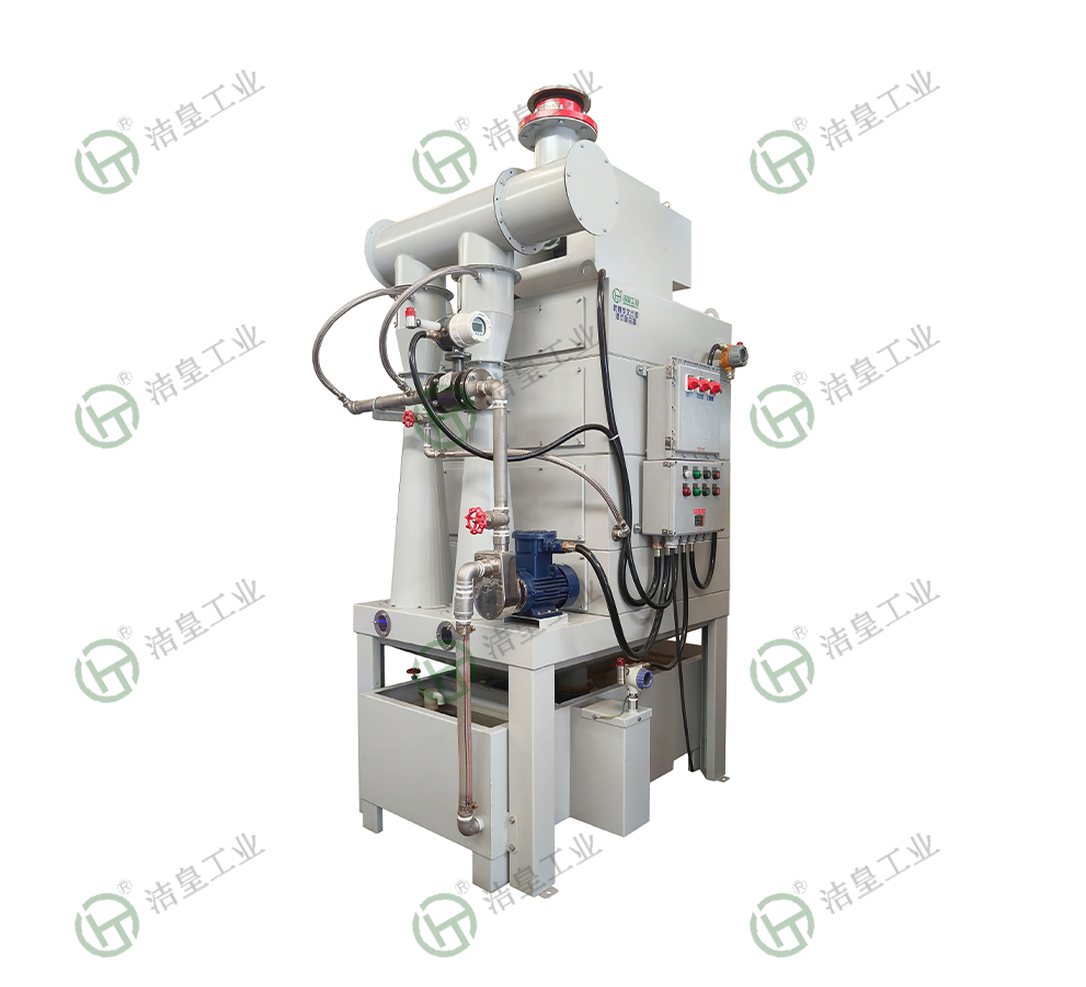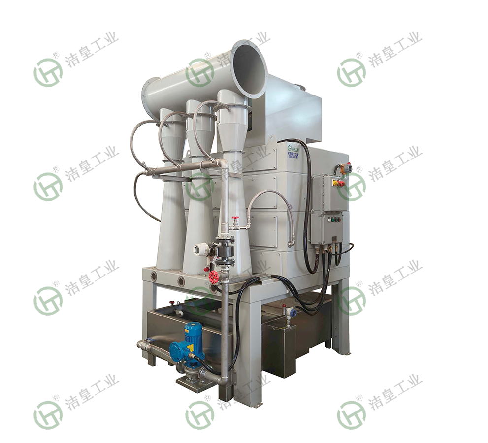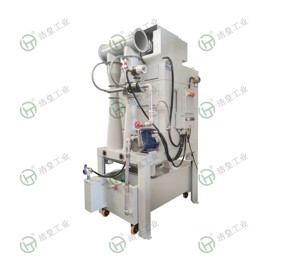 該機(jī)利用(yòng)文丘裏原理和氣相負壓使得噴淋液相形成,將(jiāng)吸入的煙霧(wù),塵埃和廢氣被水霧、水漫捕捉(zhuō)吸附形成大液(yè)滴落入沉(chén)澱(diàn)池,部分細沫通過初過濾、高效過濾除沫器浸潤吸附回落(luò)沉澱池。沉澱池沉澱水供給循環泵循環噴淋,周而複始,水位由液位器控製,進水管(guǎn)自動補給運作(zuò)所蒸發的水汽損失。沉澱池底部的淤泥或碎(suì)屑可通過撈渣口人工清理或鬥式水箱(xiāng)底部球閥排出。該機過濾(lǜ)單元無堵塞(sāi),高沉降分離效率,排出(chū)空氣符合標準。該機模塊(kuài)化設計組裝,零件噴塑處理,工況需要亦可不(bú)鏽鋼製作。粉塵(chén)濃度較大時,應加裝旋風濕式除塵器使用,可(kě)減輕過濾器壓力和損耗,更好地保證性(xìng)能。