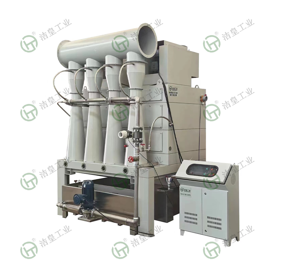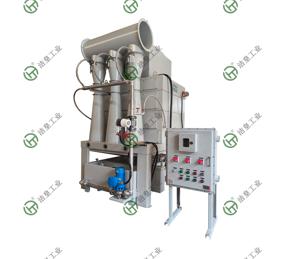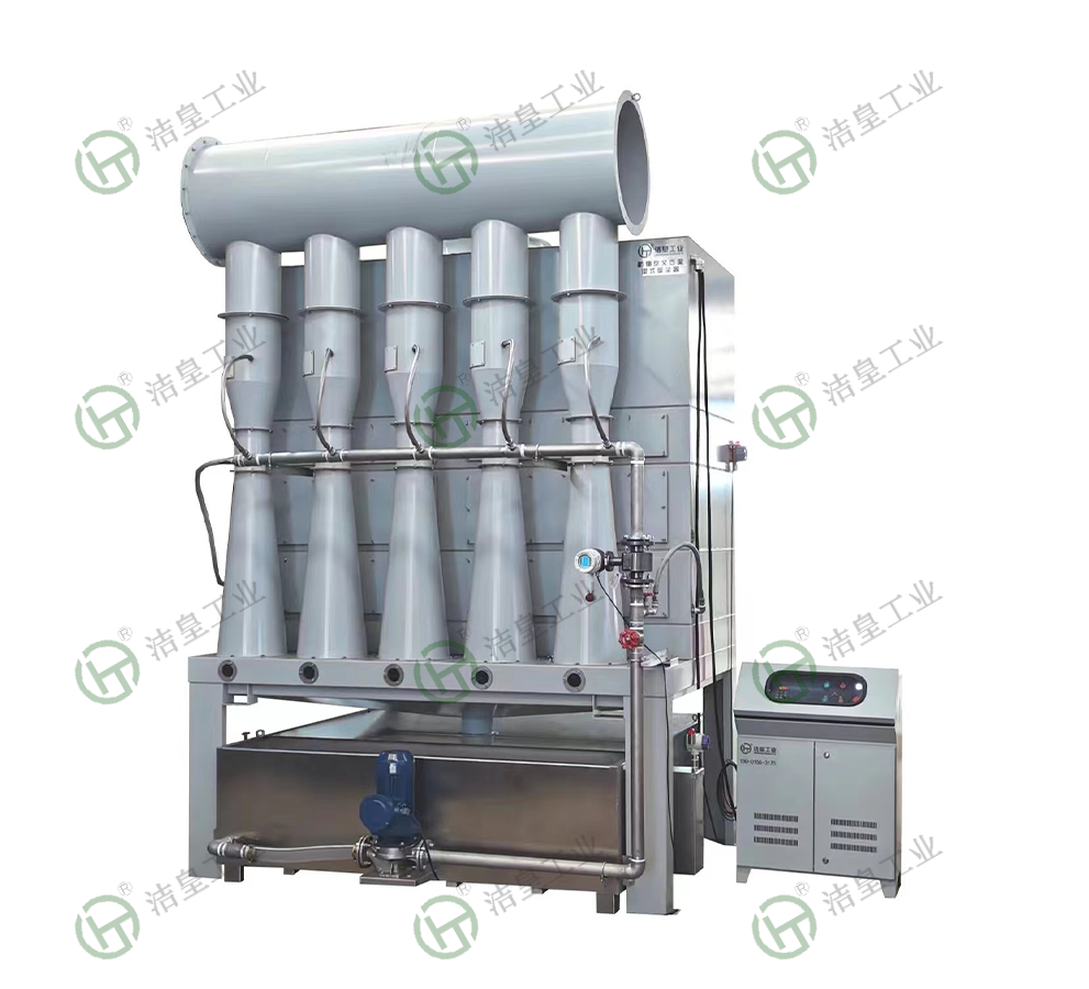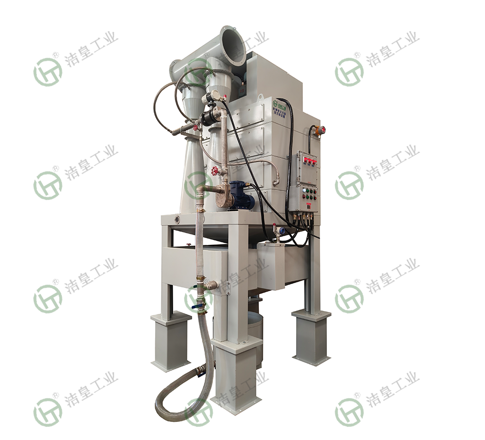 該機(jī)利用(yòng)文丘裏原理和氣相負壓使得噴淋液相形成,將(jiāng)吸入的煙霧(wù),塵埃和廢氣被水霧、水漫捕捉(zhuō)吸附形成大液(yè)滴落入沉(chén)澱(diàn)池,部分細沫通過初過濾、高效過濾除沫器浸潤吸附回落(luò)沉澱池。沉澱池沉澱水供給循環泵循環噴淋,周而複始,水位由液位器控製,進水管(guǎn)自動補給運作(zuò)所蒸發的水汽損失。沉澱池底部的淤泥或碎(suì)屑可通過撈渣口人工清理或鬥式水箱(xiāng)底部球閥排出。該機過濾(lǜ)單元無堵塞(sāi),高沉降分離效率,排出(chū)空氣符合標準。該機模塊(kuài)化設計組裝,零件噴塑處理,工況需要亦可不(bú)鏽鋼製作。粉塵(chén)濃度較大時,應加裝旋風濕式除塵器使用,可(kě)減輕過濾器壓力和損耗,更好地保證性(xìng)能。